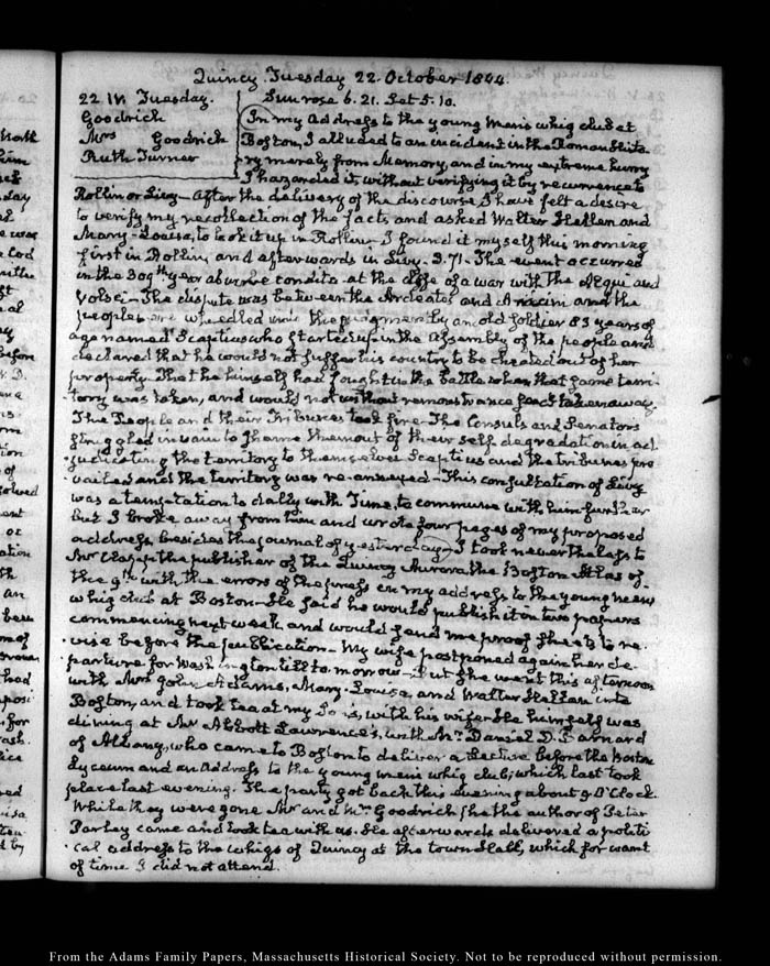 View full, authoritative transcriptions with page images of the diaries at John Quincy Adams Digital Diary part of the Primary Source Cooperative at the MHS.