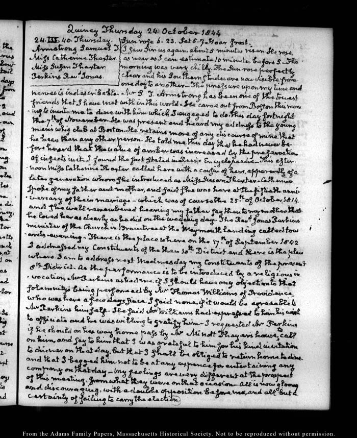 View full, authoritative transcriptions with page images of the diaries at John Quincy Adams Digital Diary part of the Primary Source Cooperative at the MHS.