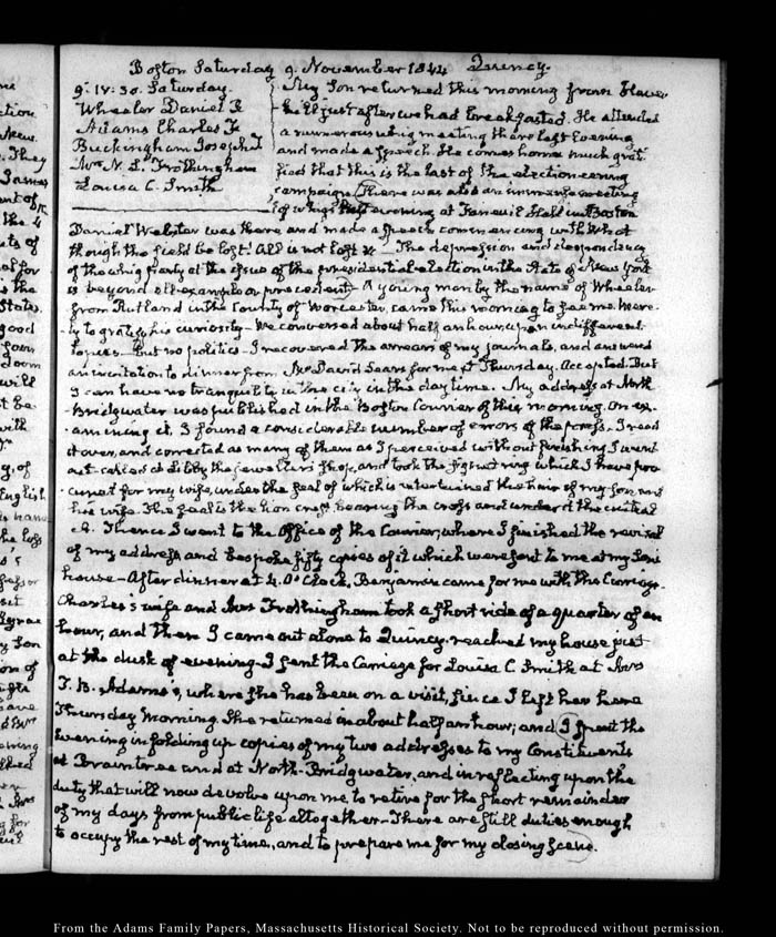 View full, authoritative transcriptions with page images of the diaries at John Quincy Adams Digital Diary part of the Primary Source Cooperative at the MHS.