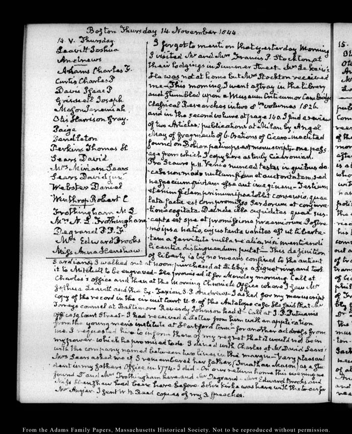 View full, authoritative transcriptions with page images of the diaries at John Quincy Adams Digital Diary part of the Primary Source Cooperative at the MHS.