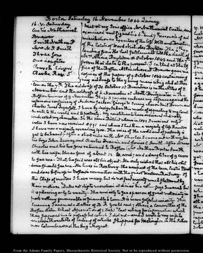 View full, authoritative transcriptions with page images of the diaries at John Quincy Adams Digital Diary part of the Primary Source Cooperative at the MHS.