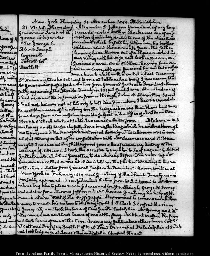 View full, authoritative transcriptions with page images of the diaries at John Quincy Adams Digital Diary part of the Primary Source Cooperative at the MHS.