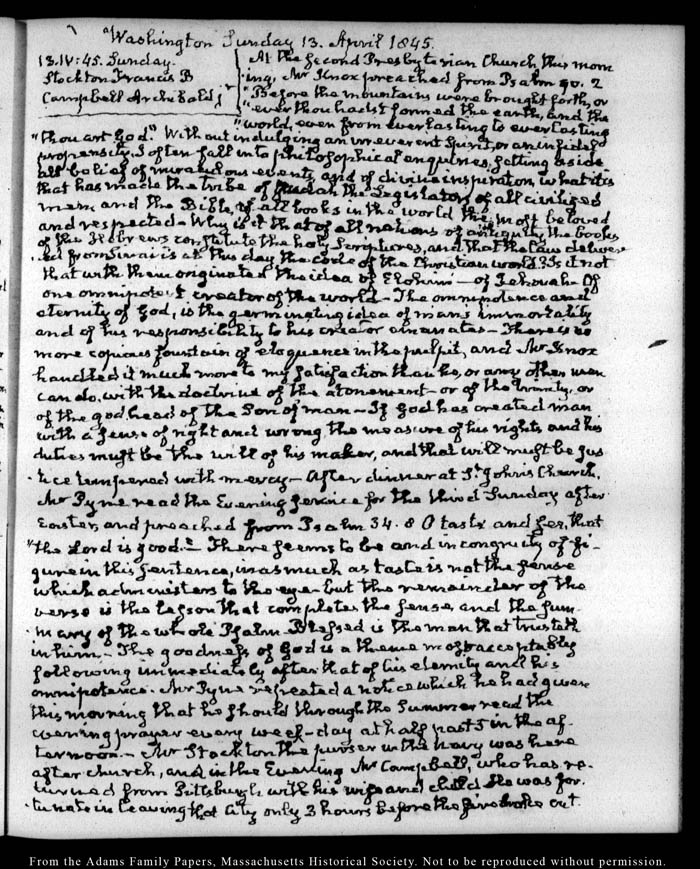 View full, authoritative transcriptions with page images of the diaries at John Quincy Adams Digital Diary part of the Primary Source Cooperative at the MHS.