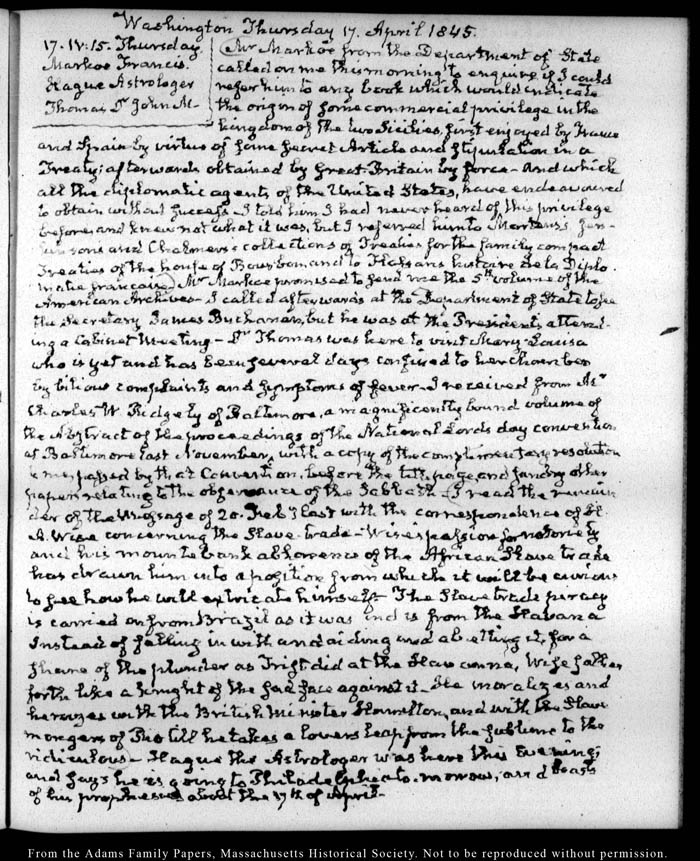 View full, authoritative transcriptions with page images of the diaries at John Quincy Adams Digital Diary part of the Primary Source Cooperative at the MHS.
