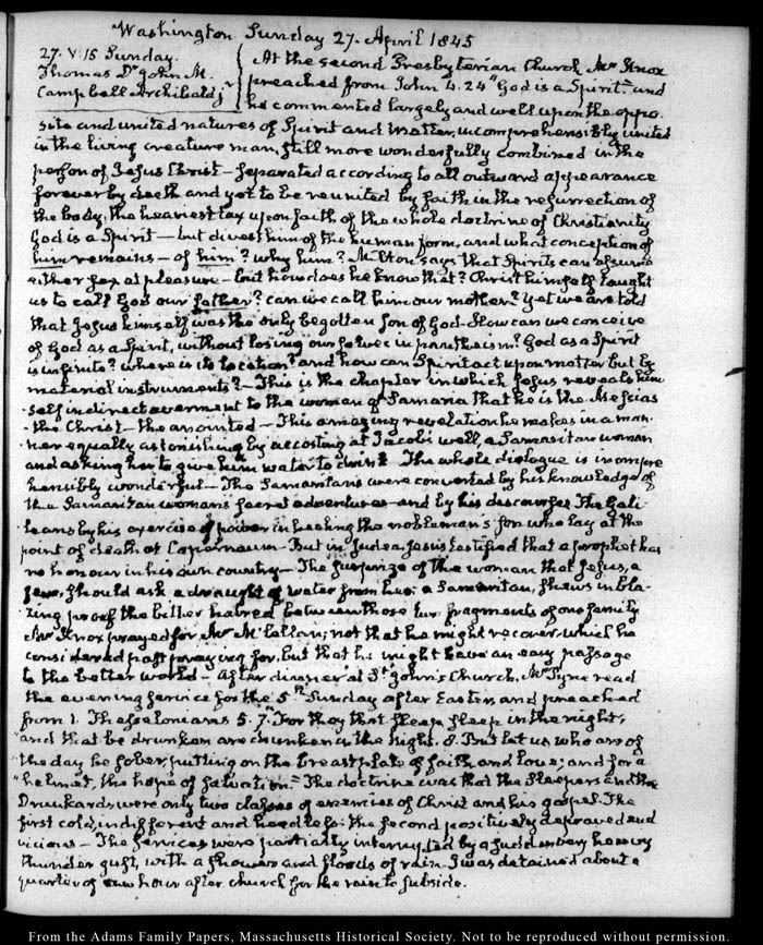 View full, authoritative transcriptions with page images of the diaries at John Quincy Adams Digital Diary part of the Primary Source Cooperative at the MHS.