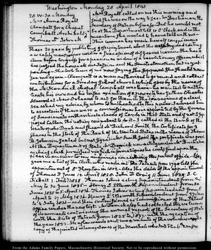 View full, authoritative transcriptions with page images of the diaries at John Quincy Adams Digital Diary part of the Primary Source Cooperative at the MHS.