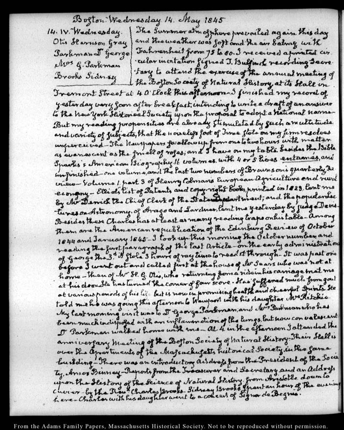 View full, authoritative transcriptions with page images of the diaries at John Quincy Adams Digital Diary part of the Primary Source Cooperative at the MHS.