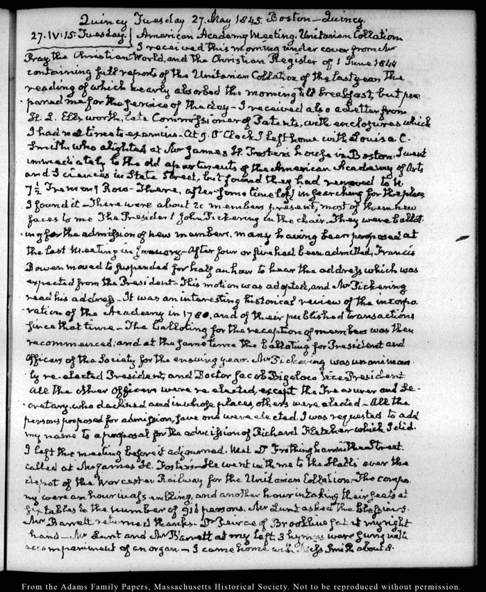 View full, authoritative transcriptions with page images of the diaries at John Quincy Adams Digital Diary part of the Primary Source Cooperative at the MHS.