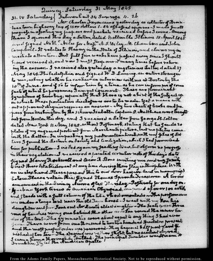 View full, authoritative transcriptions with page images of the diaries at John Quincy Adams Digital Diary part of the Primary Source Cooperative at the MHS.