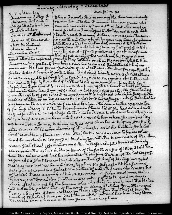 View full, authoritative transcriptions with page images of the diaries at John Quincy Adams Digital Diary part of the Primary Source Cooperative at the MHS.