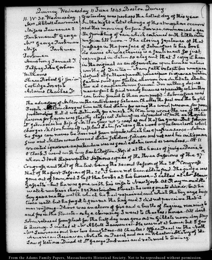 View full, authoritative transcriptions with page images of the diaries at John Quincy Adams Digital Diary part of the Primary Source Cooperative at the MHS.