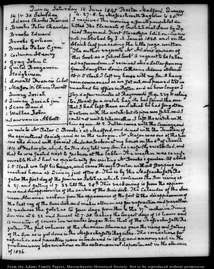 View full, authoritative transcriptions with page images of the diaries at John Quincy Adams Digital Diary part of the Primary Source Cooperative at the MHS.