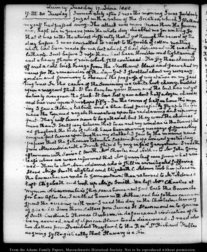 View full, authoritative transcriptions with page images of the diaries at John Quincy Adams Digital Diary part of the Primary Source Cooperative at the MHS.