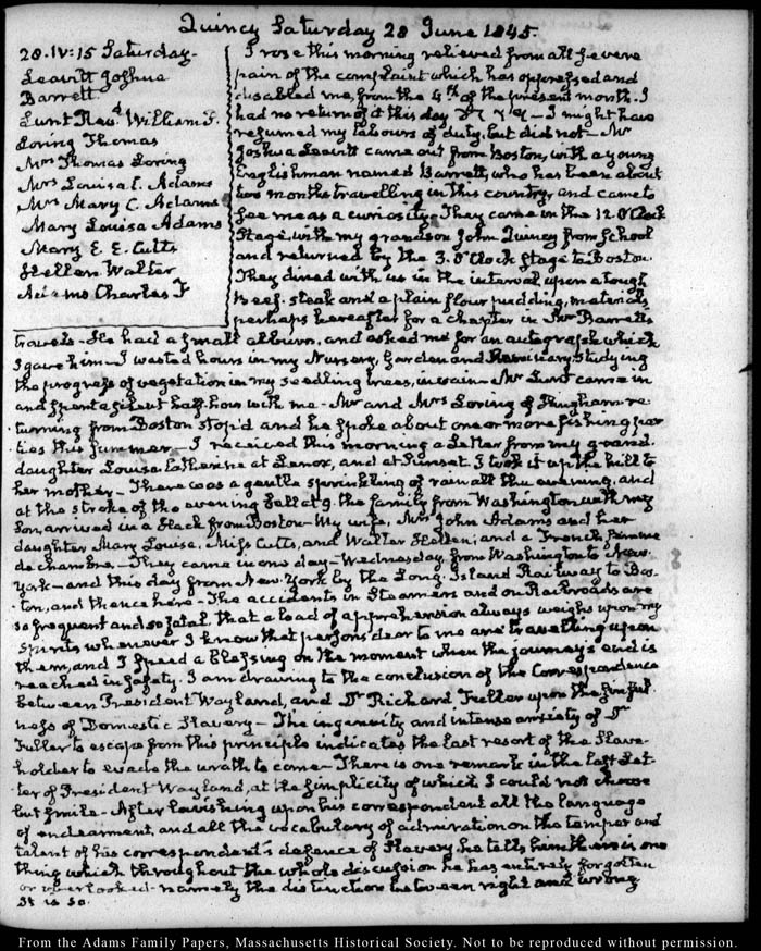 View full, authoritative transcriptions with page images of the diaries at John Quincy Adams Digital Diary part of the Primary Source Cooperative at the MHS.