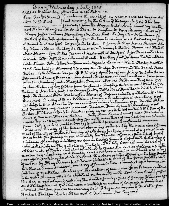 View full, authoritative transcriptions with page images of the diaries at John Quincy Adams Digital Diary part of the Primary Source Cooperative at the MHS.