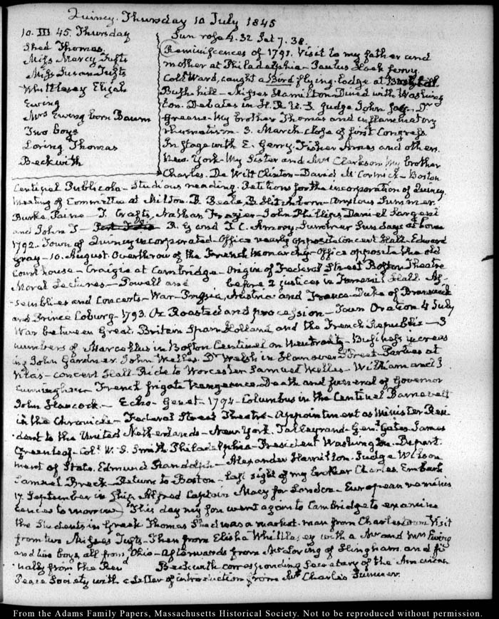 View full, authoritative transcriptions with page images of the diaries at John Quincy Adams Digital Diary part of the Primary Source Cooperative at the MHS.