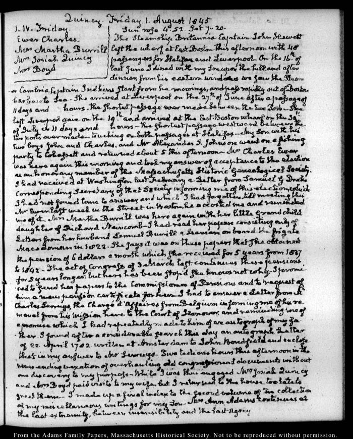 View full, authoritative transcriptions with page images of the diaries at John Quincy Adams Digital Diary part of the Primary Source Cooperative at the MHS.