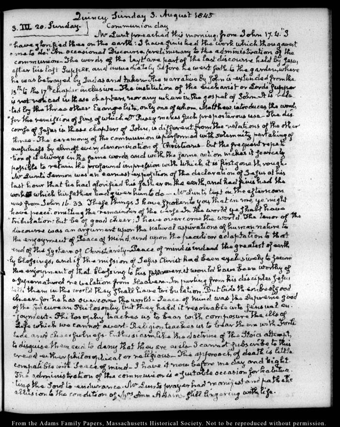 View full, authoritative transcriptions with page images of the diaries at John Quincy Adams Digital Diary part of the Primary Source Cooperative at the MHS.
