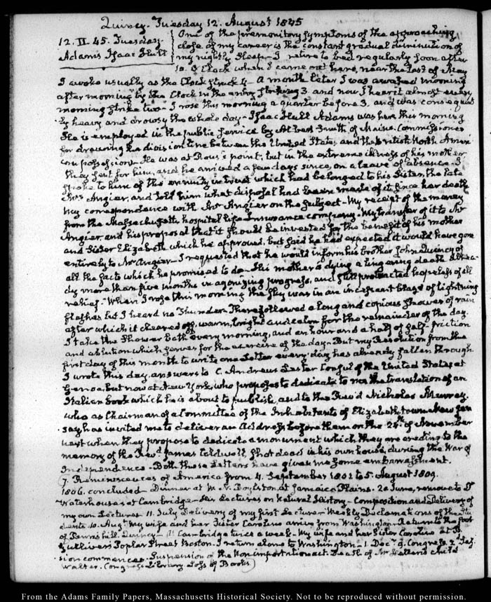 View full, authoritative transcriptions with page images of the diaries at John Quincy Adams Digital Diary part of the Primary Source Cooperative at the MHS.