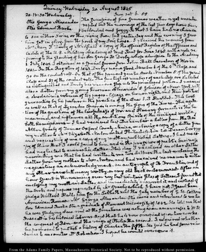 View full, authoritative transcriptions with page images of the diaries at John Quincy Adams Digital Diary part of the Primary Source Cooperative at the MHS.