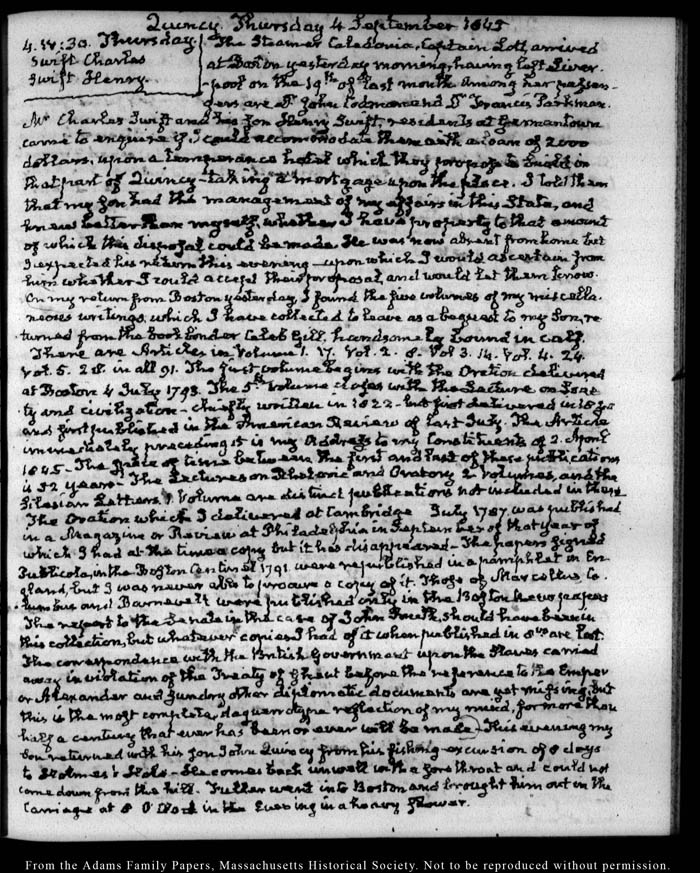 View full, authoritative transcriptions with page images of the diaries at John Quincy Adams Digital Diary part of the Primary Source Cooperative at the MHS.