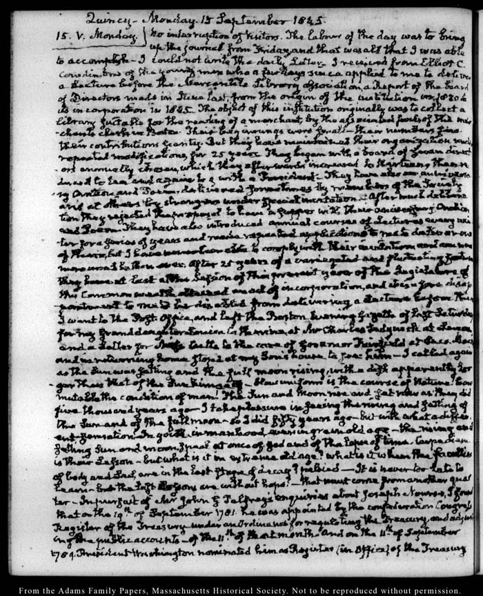 View full, authoritative transcriptions with page images of the diaries at John Quincy Adams Digital Diary part of the Primary Source Cooperative at the MHS.