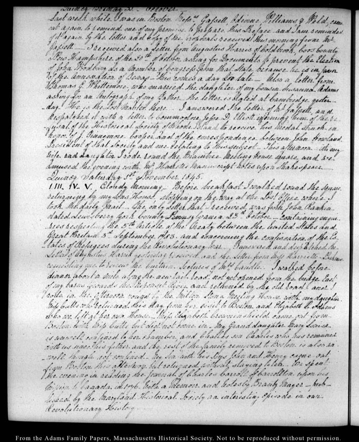 View full, authoritative transcriptions with page images of the diaries at John Quincy Adams Digital Diary part of the Primary Source Cooperative at the MHS.