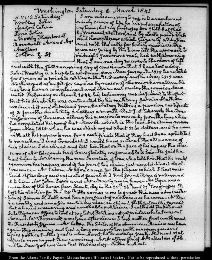 View full, authoritative transcriptions with page images of the diaries at John Quincy Adams Digital Diary part of the Primary Source Cooperative at the MHS.