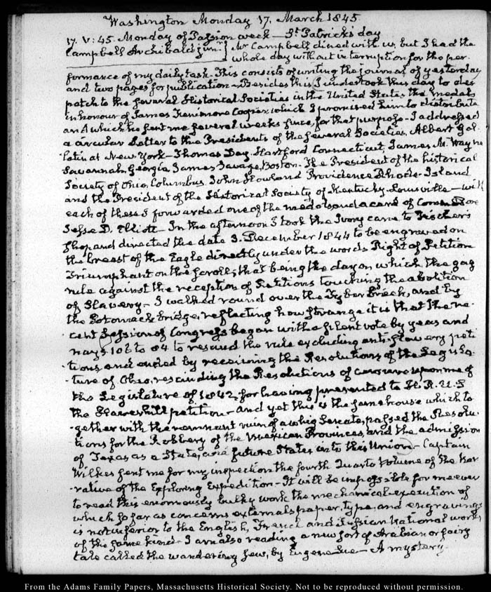 View full, authoritative transcriptions with page images of the diaries at John Quincy Adams Digital Diary part of the Primary Source Cooperative at the MHS.