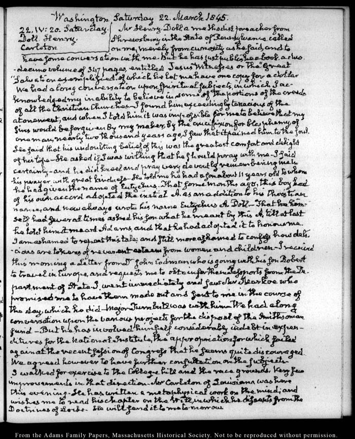 View full, authoritative transcriptions with page images of the diaries at John Quincy Adams Digital Diary part of the Primary Source Cooperative at the MHS.