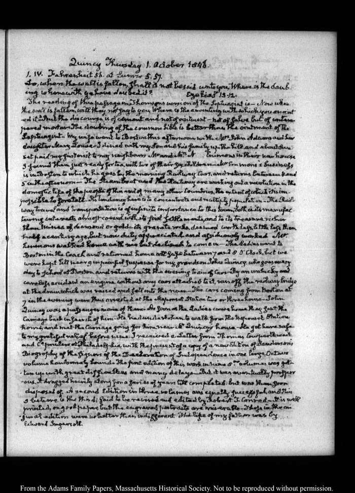 View full, authoritative transcriptions with page images of the diaries at John Quincy Adams Digital Diary part of the Primary Source Cooperative at the MHS.