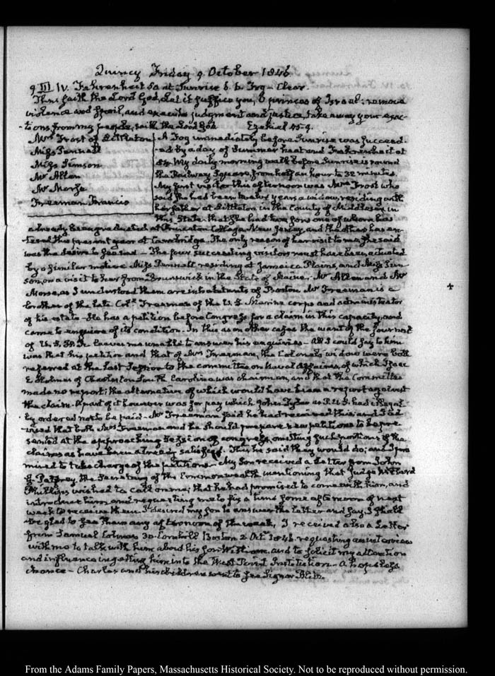 View full, authoritative transcriptions with page images of the diaries at John Quincy Adams Digital Diary part of the Primary Source Cooperative at the MHS.