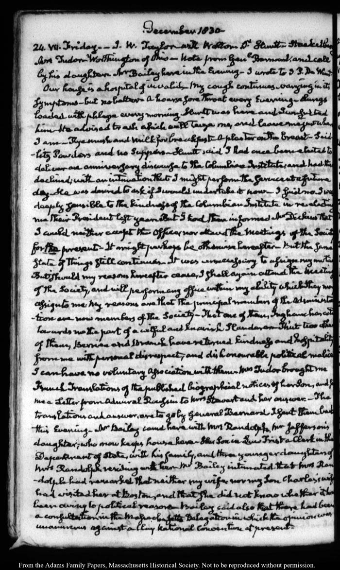 View full, authoritative transcriptions with page images of the diaries at John Quincy Adams Digital Diary part of the Primary Source Cooperative at the MHS.