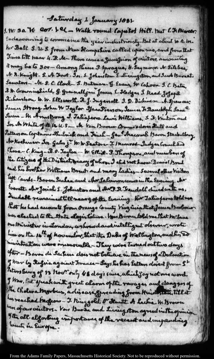 View full, authoritative transcriptions with page images of the diaries at John Quincy Adams Digital Diary part of the Primary Source Cooperative at the MHS.