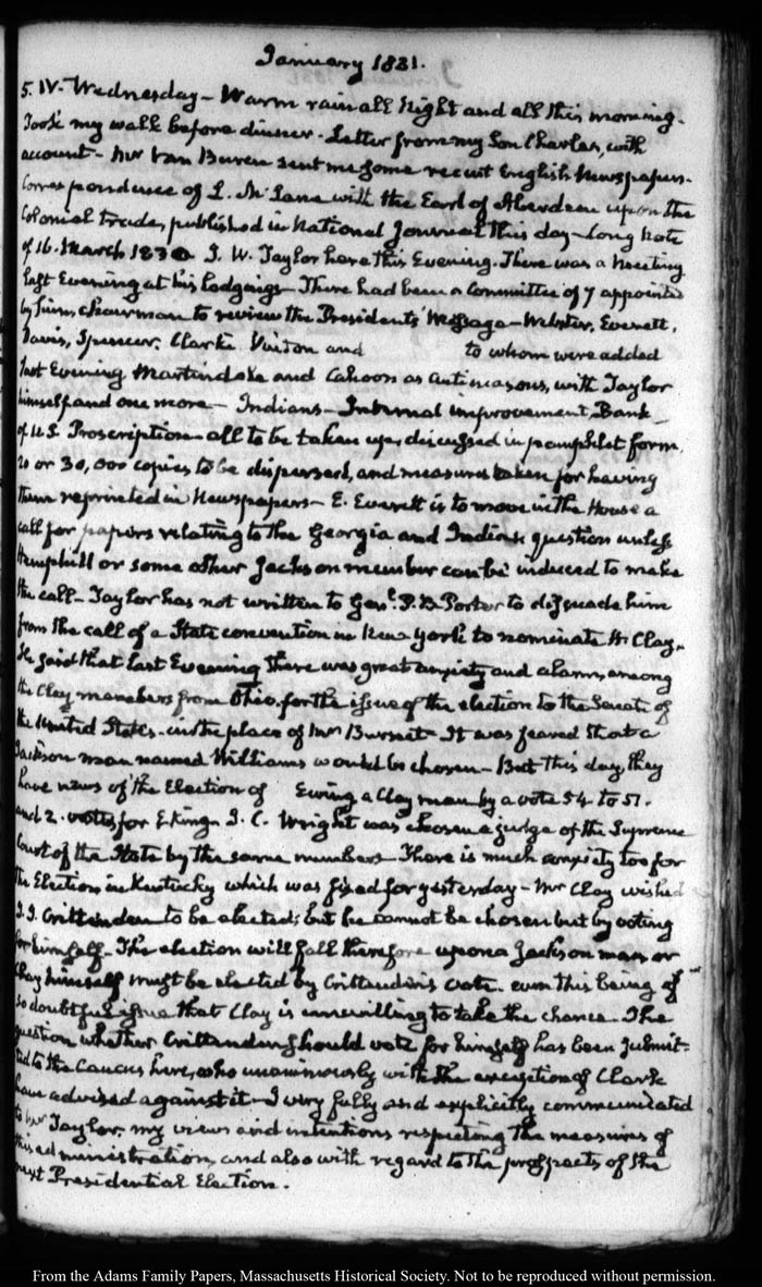 View full, authoritative transcriptions with page images of the diaries at John Quincy Adams Digital Diary part of the Primary Source Cooperative at the MHS.