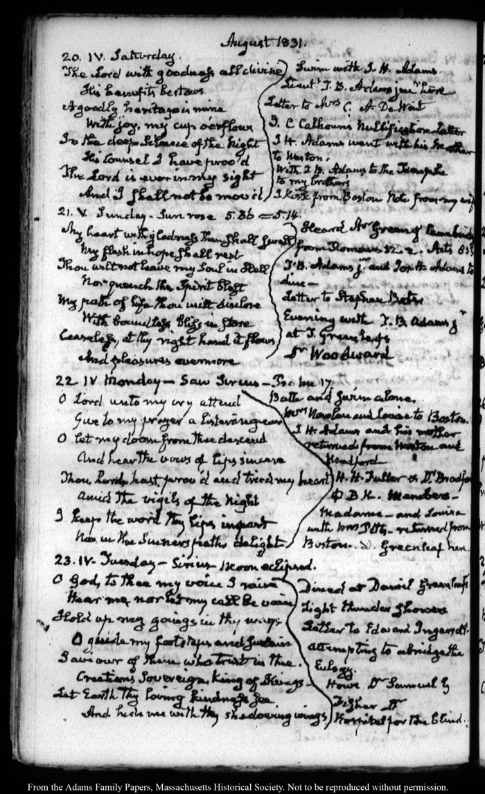 View full, authoritative transcriptions with page images of the diaries at John Quincy Adams Digital Diary part of the Primary Source Cooperative at the MHS.
