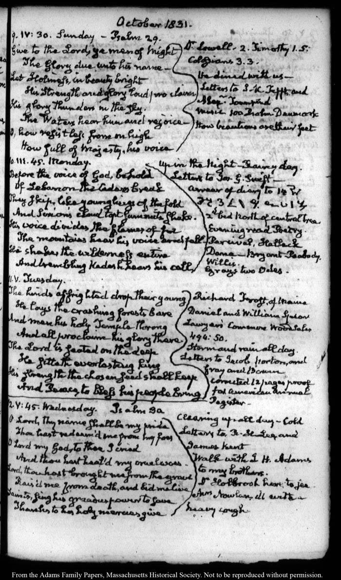 View full, authoritative transcriptions with page images of the diaries at John Quincy Adams Digital Diary part of the Primary Source Cooperative at the MHS.