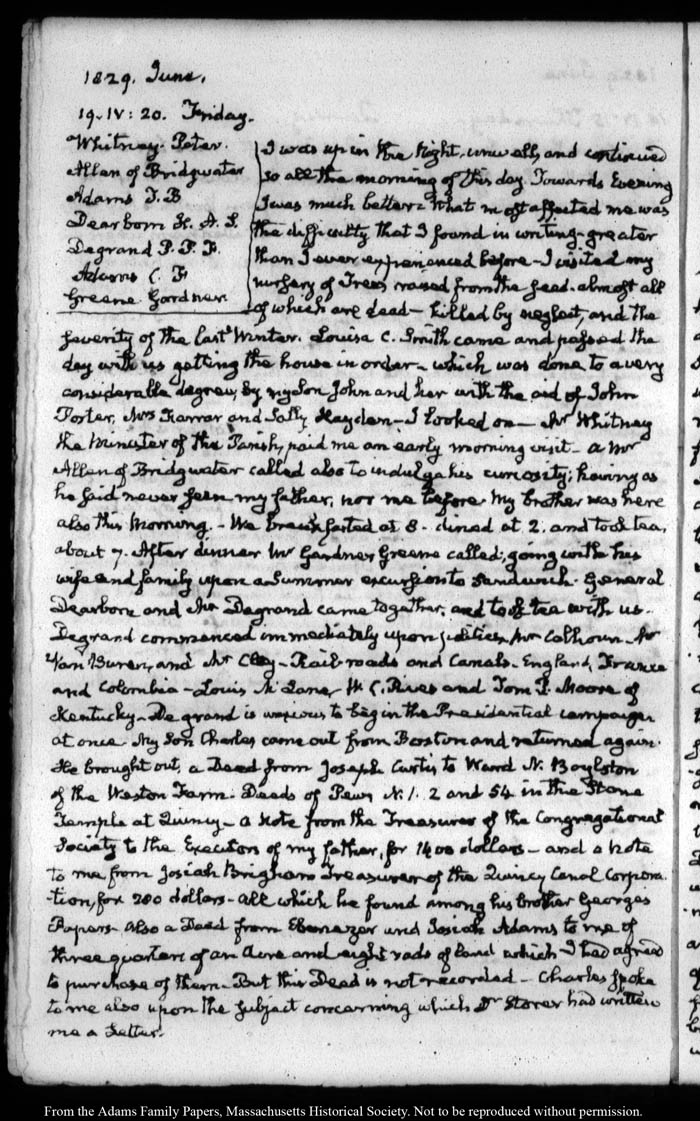 View full, authoritative transcriptions with page images of the diaries at John Quincy Adams Digital Diary part of the Primary Source Cooperative at the MHS.
