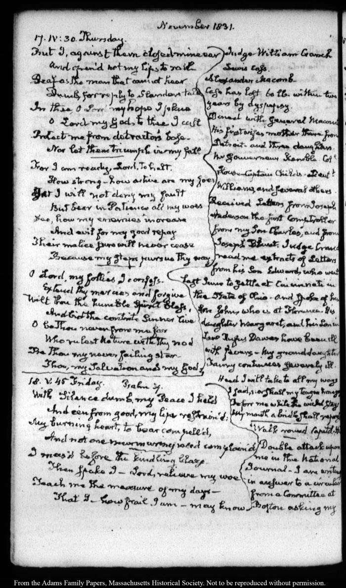 View full, authoritative transcriptions with page images of the diaries at John Quincy Adams Digital Diary part of the Primary Source Cooperative at the MHS.