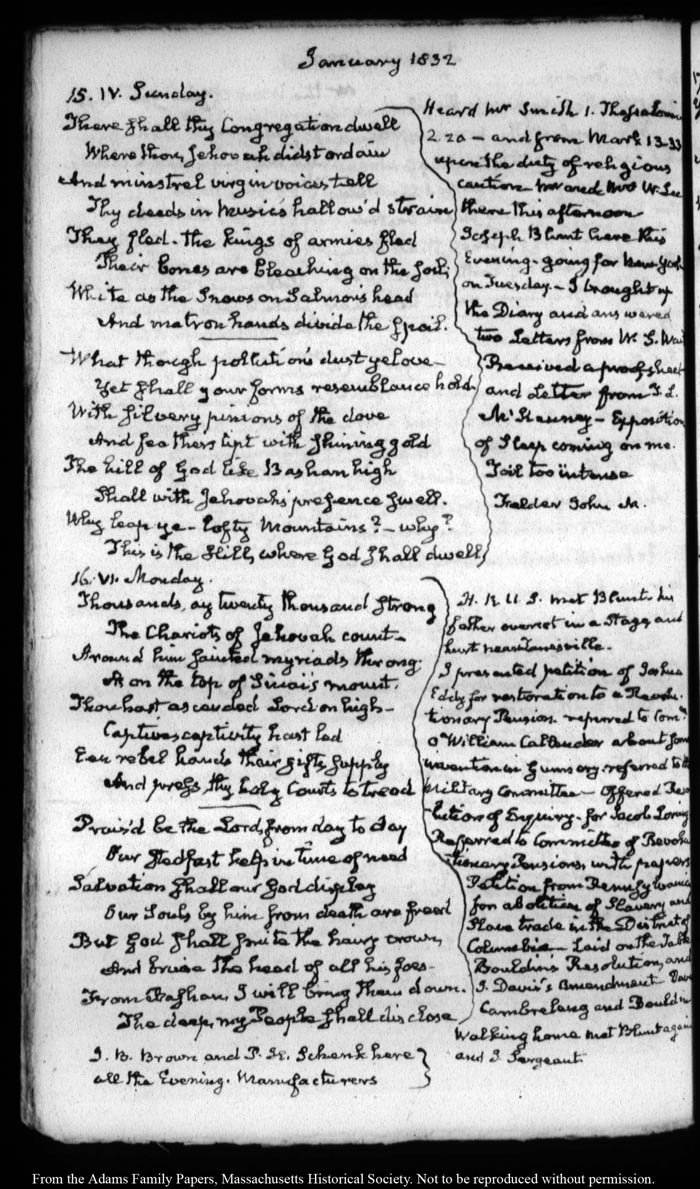 View full, authoritative transcriptions with page images of the diaries at John Quincy Adams Digital Diary part of the Primary Source Cooperative at the MHS.