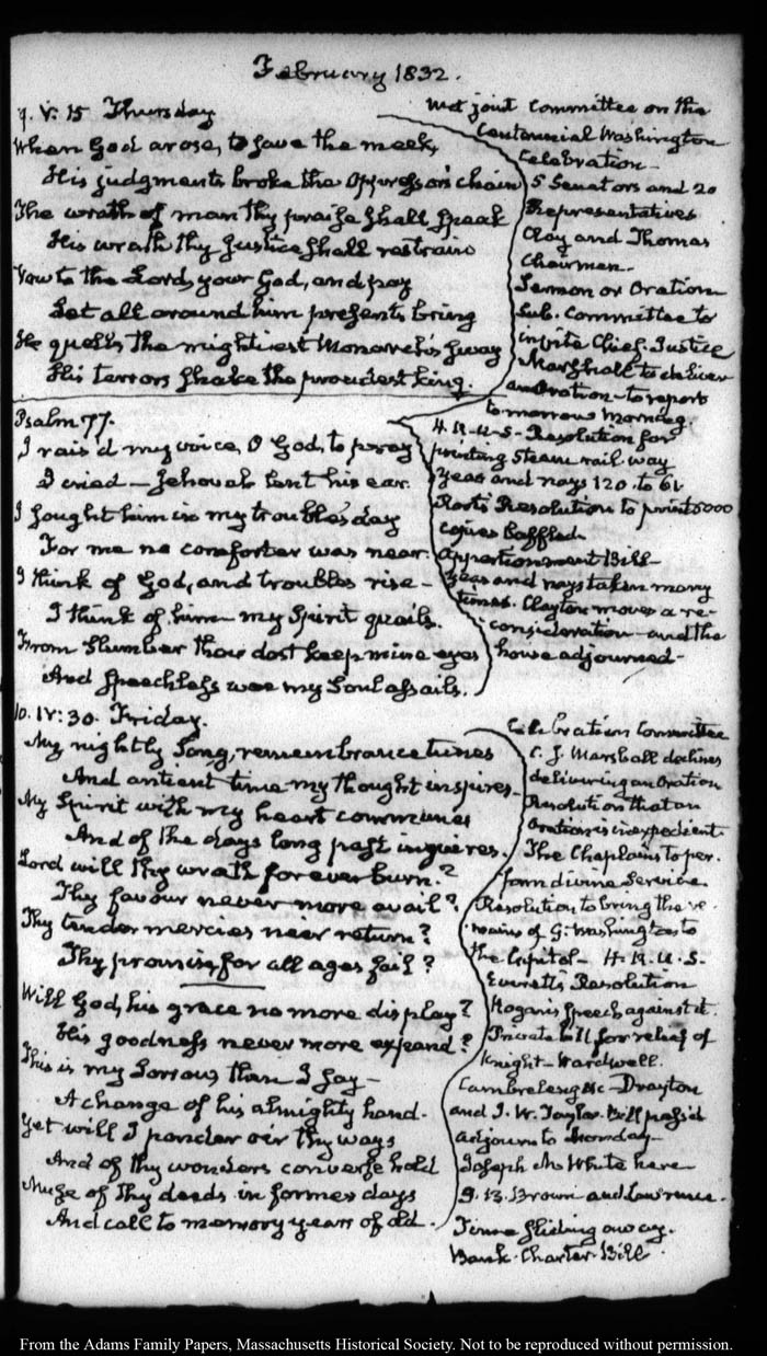 View full, authoritative transcriptions with page images of the diaries at John Quincy Adams Digital Diary part of the Primary Source Cooperative at the MHS.