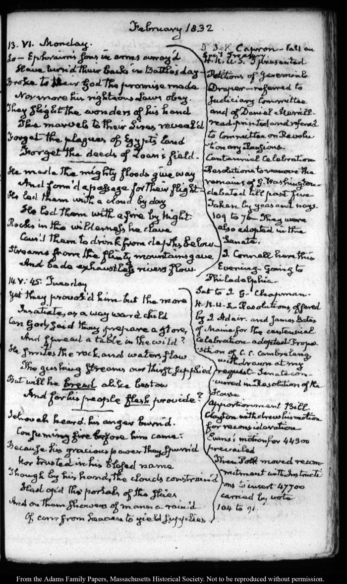 View full, authoritative transcriptions with page images of the diaries at John Quincy Adams Digital Diary part of the Primary Source Cooperative at the MHS.