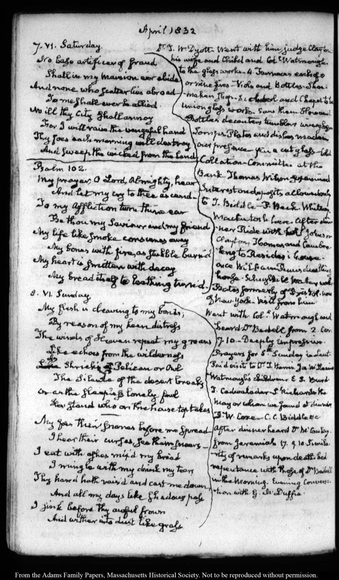View full, authoritative transcriptions with page images of the diaries at John Quincy Adams Digital Diary part of the Primary Source Cooperative at the MHS.