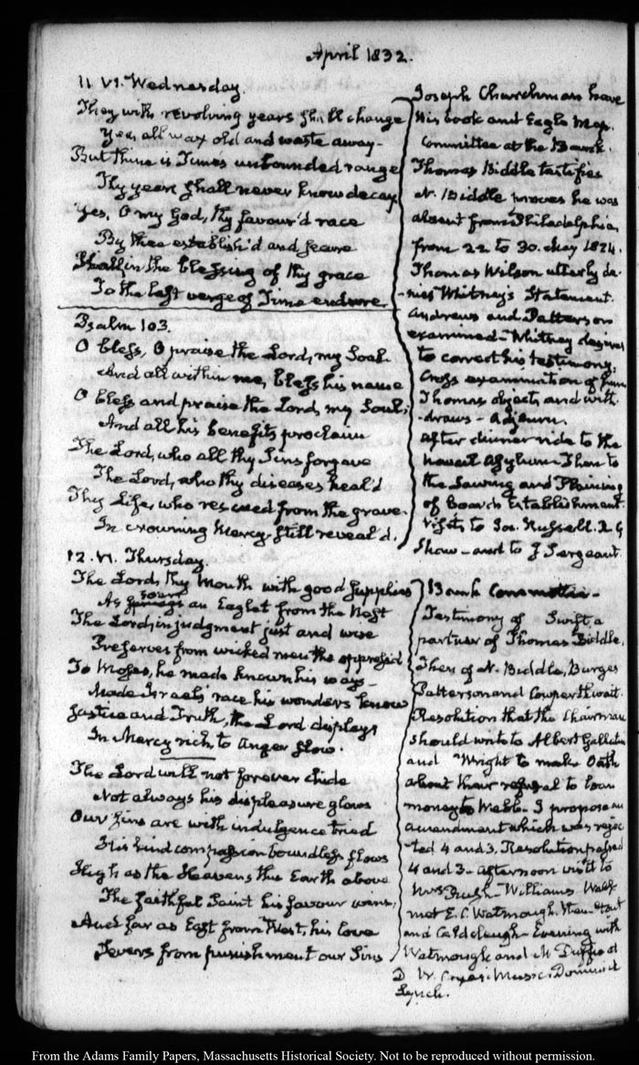 View full, authoritative transcriptions with page images of the diaries at John Quincy Adams Digital Diary part of the Primary Source Cooperative at the MHS.
