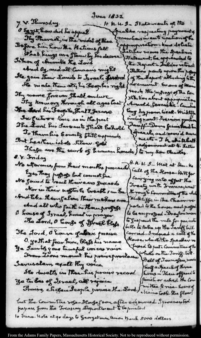 View full, authoritative transcriptions with page images of the diaries at John Quincy Adams Digital Diary part of the Primary Source Cooperative at the MHS.