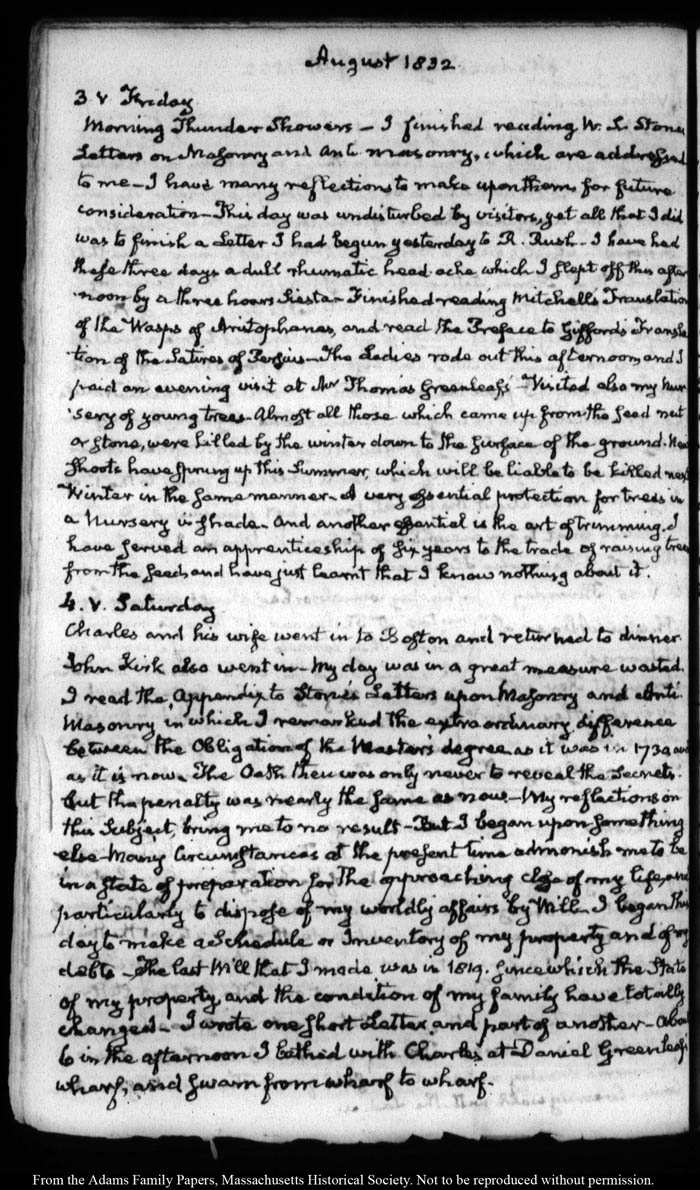 View full, authoritative transcriptions with page images of the diaries at John Quincy Adams Digital Diary part of the Primary Source Cooperative at the MHS.