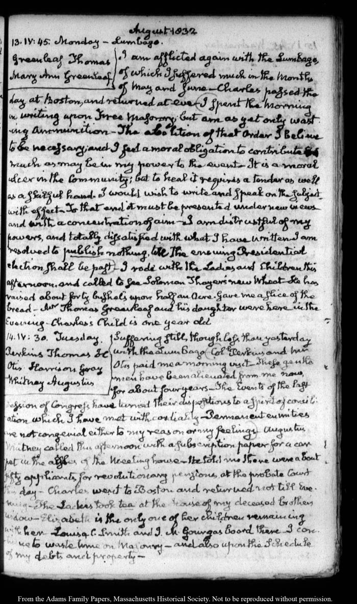 View full, authoritative transcriptions with page images of the diaries at John Quincy Adams Digital Diary part of the Primary Source Cooperative at the MHS.
