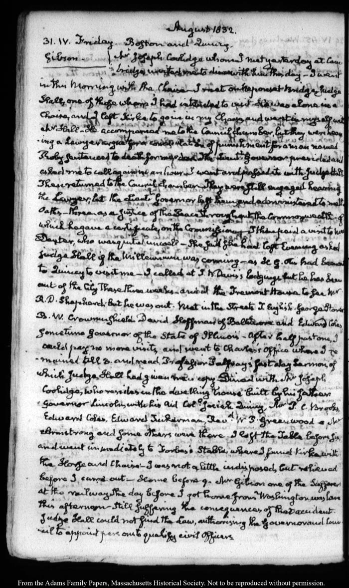 View full, authoritative transcriptions with page images of the diaries at John Quincy Adams Digital Diary part of the Primary Source Cooperative at the MHS.