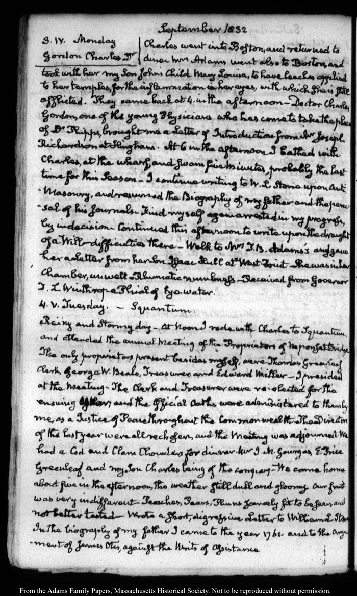 View full, authoritative transcriptions with page images of the diaries at John Quincy Adams Digital Diary part of the Primary Source Cooperative at the MHS.