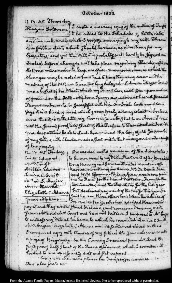 View full, authoritative transcriptions with page images of the diaries at John Quincy Adams Digital Diary part of the Primary Source Cooperative at the MHS.